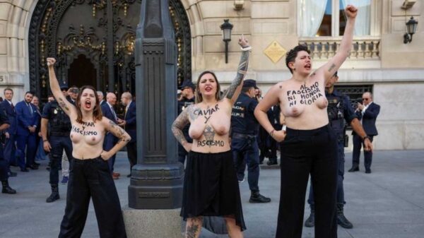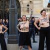 Activistas del grupo por los derechos de la mujer Femen protestaron y contra la visita a España del presidente Javier Milei frente al Casino de Madrid, donde el mandatario fue premiado por...
