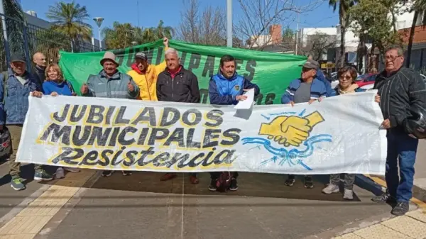 Juan Carlos Torres, referente de los trabajadores municipales en actividad, y Carlos Vulecovich, referente de los jubilados municipales, encabezaron una manifestación frente a la...