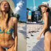Se lució con un traje de baño de dos piezas de base naranja shocking y estampado de flores fucsias.